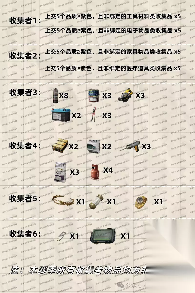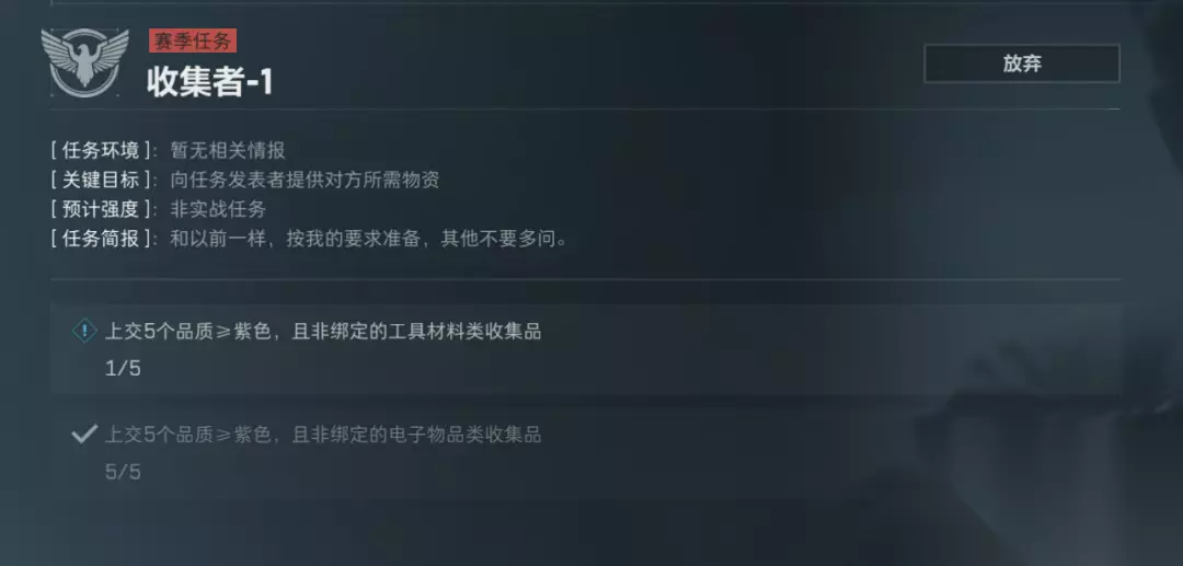 收集者1: 上交5个品质大于等于紫色的非绑定工具材料类收藏品; 上交5个品质大于等于紫色的非绑定电子物品类收藏品