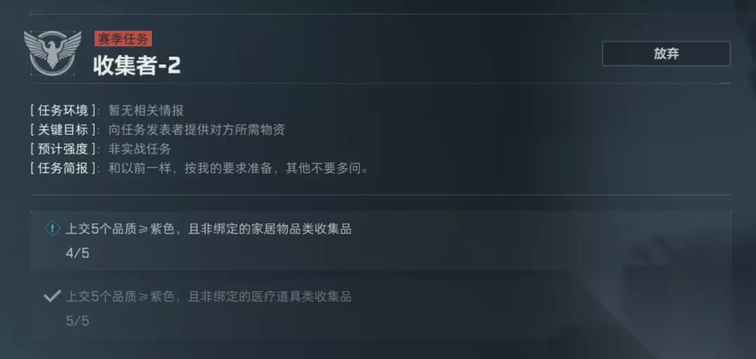 收集者2: 上交5个品质大于等于紫色的非绑定家居物品类收藏品; 上交5个品质大于等于紫色的非绑定医疗道具类收藏品