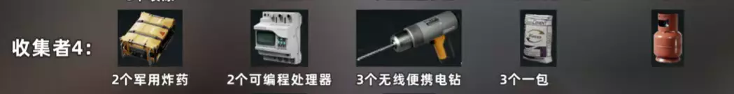 军用炸药X2; 可编程处理器X2; 无线便携电钻X3; 一包水泥X3; 燃气罐X4 收集者5: