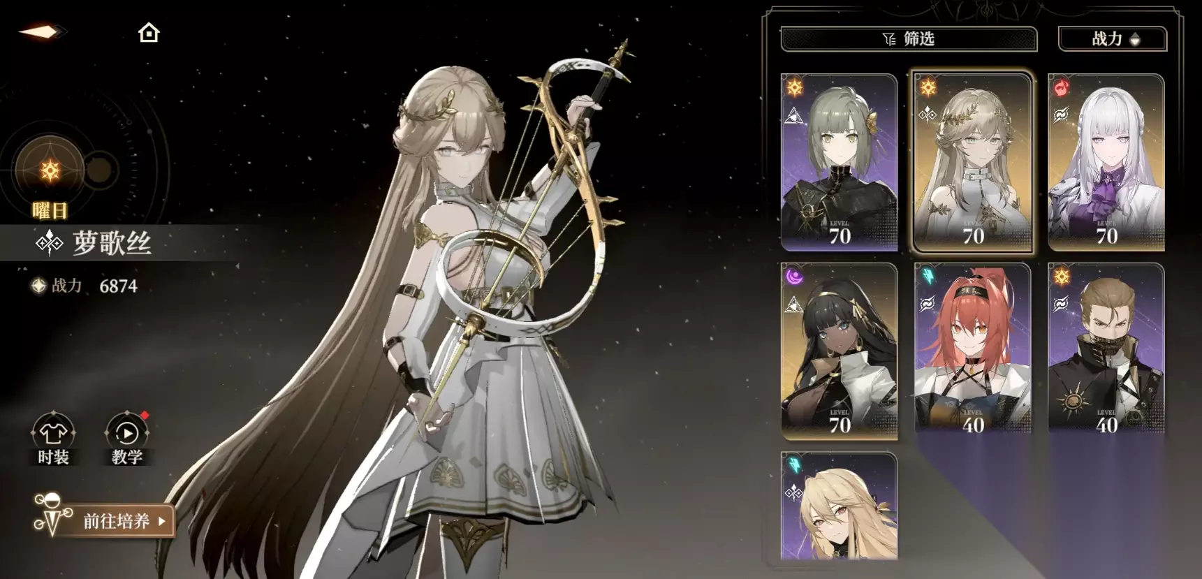 3、萝歌丝 萝歌丝普攻有4段,第4段命中会得到1枚弦音,她的被动是每次释放“变奏”和满蓄力的“协奏”时,会进入到调律,若弦音数量同时也达到上限会对其进行清空,并让普攻变成向四周发动范围攻击,并在场上召唤出会10秒音符,音符会自动跟随角色,让场上生命高于80%的队友获得攻击加成,并在有队友发动攻击时协同进攻,她的“变奏”会向前突刺,命中敌人后得到1枚弦音,并短暂进入到调律状态,若已经在该状态下则额外再形成一次伤害; 她的“协奏”会向前刺击并得到一枚弦音,长按可蓄力,根据时间最多会追加三次伤害,蓄满还会让自身额外再得一枚弦音并进入调律,若已经处于则进行多重刺击,她的终结技会挥剑连续穿刺,有音符的情况下释放还能对其强化,让效果变为只要有队友生命为80%以上,就让全队都得到伤害增幅。
