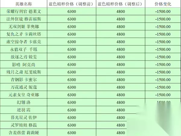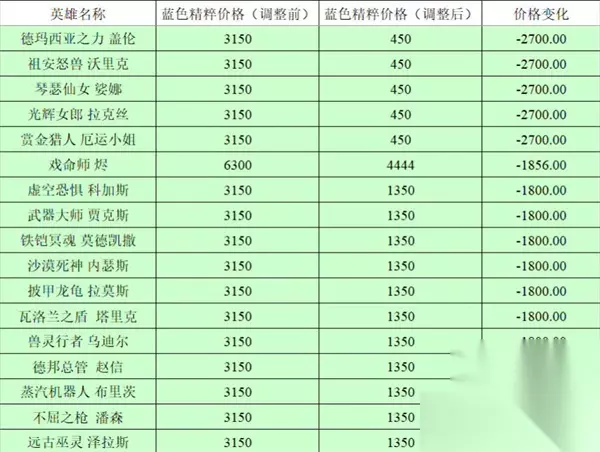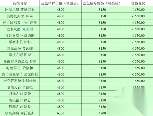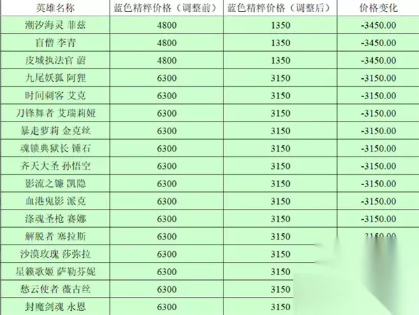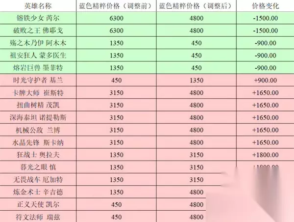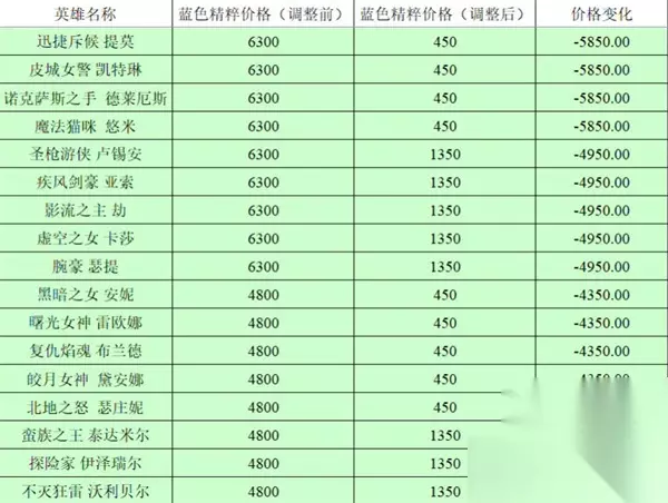 英雄联盟全英雄价格调整前后对比2023,英雄联盟今天更新了13.5版本,很多人知道英雄的价格进行了调整,不少人不知道调整前后的价格到底相差多少,下面跟着小编一起来看看吧。 英雄联盟全英雄价格调整前后对比2023 1:如图所示,下图是全英雄的前后价格调整对比,第一列是英雄名字,第二列是调整前的价格,第三列是调整后的价格,第四列是价格的变化,同时对于价格没有变化的小编没有罗列出来; 2:还有就是不仅仅是英雄的精粹购买价格下调,点券购买的价格也是下调的,因为很少人用点券购买英雄,所以小编没有进行对比; 3:如图所示由提莫,凯特琳,诺手,猫咪,卢锡安,亚索,劫,卡莎,瑟提,安妮,蕾欧娜,火男,皎月,猪妹,蛮王,ez,狗熊的价格变化;