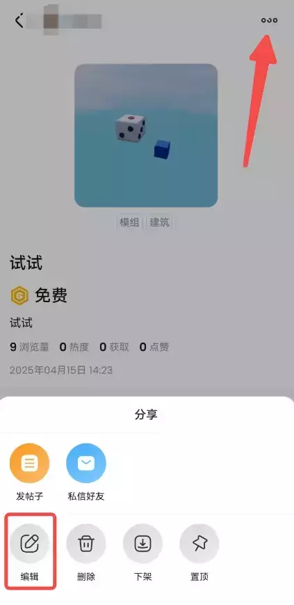 进入选定的模组页面后,点击右上角“…”,在底部出现操作按钮后,选择“编辑”进入编辑页面