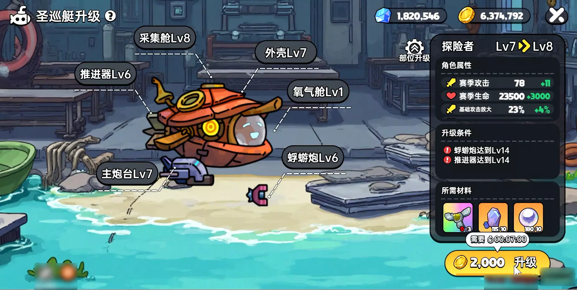 勇士们可以通过升级来提升圣巡艇及其各部位的等级,从而提升属性。