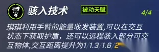 被动天赋2: 琪琪利用手臂的能量收发装置,可以在交互状态下获取护盾,还可以远程骇入部分可交互物体,交互距离提升为1/1.3/1.6/2格。