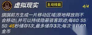 琪琪角色介绍 主动技能:虚拟现实 琪琪前方生成一片移动区域(原地释放则不会移动),并可以持续隐蔽骇客踪迹;每60555045秒储存1次,最多储存3次;每次消耗60金币。