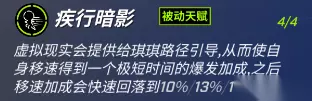 被动天赋1: 虚拟现实会提供给琪琪路径引导,从而使自身移速得到一个极短时间的爆发加成,之后移速加成会快速回落到10%/13%/16%/20%。