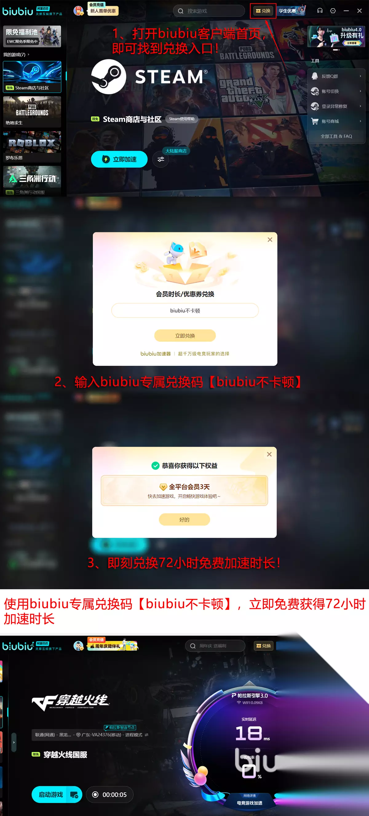 当然没用过的人还是想先试一下,新人可领取24H的免费加速,用了后就发现所有问题都没了。若是还打算多玩一段时间的话,那么新老用户可输入兑换码【biubiu不卡顿】,即可额外领取三天免费加速;总的来说,新人就算是能获取96H的免费加速了!