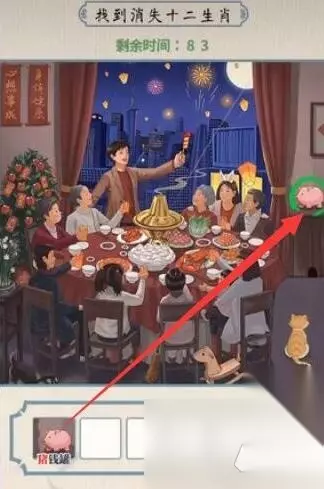 无敌脑洞王者十二生肖攻略 找到消失十二生肖:猪钱罐、小狗、蛇果、窜天猴、虎皮凤爪、鸡毛掸子、龙虾、兔耳朵、木马、牛油果、羊肉卷、老鼠。 具体操作 1、小猪存钱罐,下面是老鼠。