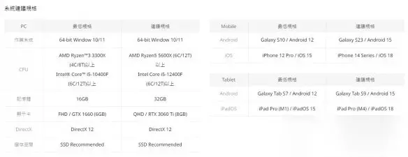 根据官方公布的配置信息,想要流畅体验亚特雷亚大陆的壮丽景色,玩家需要配备Windows 10/11 64位操作系统。最低配置要求包括AMD Ryzen 3 3300X或Intel Core i5-10400F处理器、16GB内存和NVIDIA GeForce GTX 1660显卡,这确保了在1080p分辨率下的基本流畅运行。