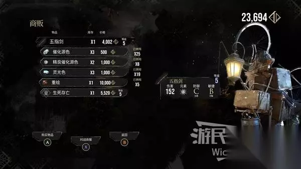 从房屋出来,转头面对房屋往左侧市场走,市场路牌下方左侧有个正在做生意的【刷头精商人】,与其对话可在商店购买符纹【生死存亡】,对战商贩可解锁武器【五指剑】的购买权限。