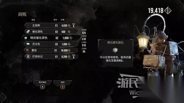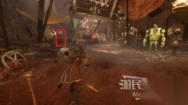 这个接任务的刷头精右侧有个往里走的过道,走到尽头遇到个抢劫的刷头精,与其战斗并获得胜利解锁商店二,此处可购买符纹【疗愈标记】和武器【五指刺】。