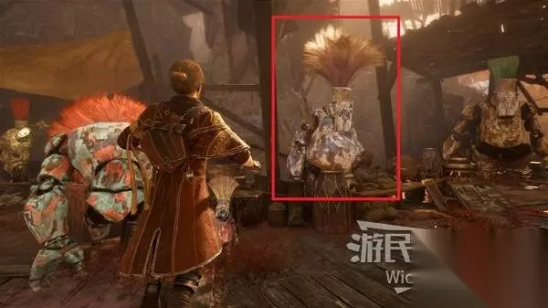 回到救小孩的那个高个刷头精位置,往左走,看到两个巨型刷头精正在战斗,穿过有一群正在起哄的刷头精,走到尽头左拐,可在一个壶口捡到一个【灵光色】。