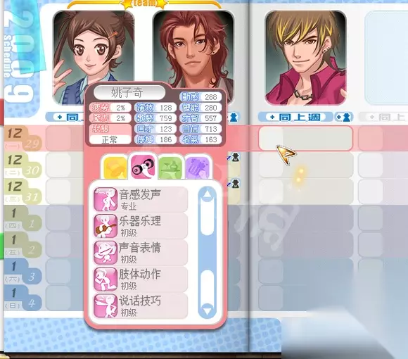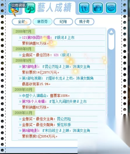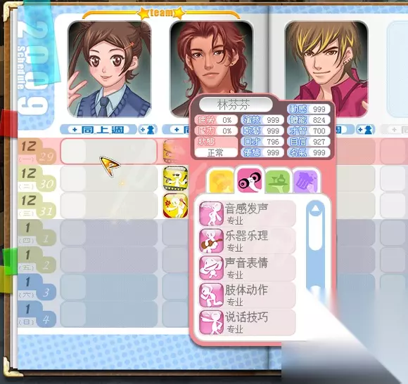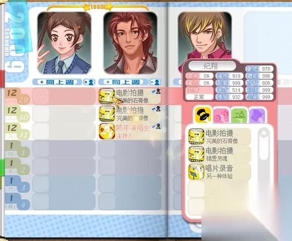 明星志愿3六大国际通告攻略流程 一、角色选择: 1、林MM:成长属性好,全程不耽误时间(全程无休假,分手想出国我也没批准,注意她第二年初会被贺总挖墙脚),萧MM第二轮不死要休3个月假,苏MM成长属性不如林。 2、纪翔(吉祥):4月初就能加入(不断免费续约可以把好感加满,分成35%),第二年中期(歌艺500-600)免费得音乐认证(当过学院老师就是吊啊!可以节省很多时间) 其他随意了,我签了欧mm(收纪少必备步骤,全程没安排行程),姚子琪是因为之前没签过他,过剧情时发现签他便宜就签着玩了,全程休息,除了偶尔林和纪都出国时我为了节省时间跟随他练“音感发声”。塞外旅行触发昆仑、秀场打工拿狐眼、生病得天使羽翼、日本旅游得九尾、益智节目拿昆仑软件都是纪翔完成的,不过全程没鸟他,姚子琪还送了我3首歌,我也没制作。 为什么不选属性好作品多的关古威?首先纪出场时间早关3个月,初期关键的3个月能做很多事了,好好培养到7月他的属性比关要强,而且为了早日完成银河必须尽早组团;二是自带的音乐认证,只要拿个舞蹈证书就行,可以节省很多时间,全力打好辅助。 二、关键通告分配: 林:歌艺700、仪态700、自信550。演技600、名气680 、体能500、才智550 三证 纪:演技550、名气600、歌艺550、动感700、体能700、自信550 音乐、舞蹈两证 1、落入凡间的天使(林) 慈善义演的邀约条件:歌艺300、仪态300、人气3(只会请女艺人),参加过“饥饿百分百”,且有国际音乐学院的证书(音乐进修必须音感发声和乐器乐理专业,说话技巧或者快速记忆高级。),个人唱片大于5张,开过演唱会(最好是大型的)后的周末,歌艺700、名气500、仪态700、自信550。 2、末日战士 (林) 至少一次电影主角,且接演电影大于4部的艺人,会大方接受,演技600、名气550、体能500、才智550;准备天数足够,且拿到国际戏剧学院证书。 3、昆仑历险.(林) 男主角:戏剧、音乐证书;女主角一:舞蹈、戏剧证书;女主角二:舞蹈、音乐 男主角--1 演技>500 名气>640 仪态>520 动感>465需要"音乐认证跟戏剧认证" 女主角--2 演技>530 名气>680 仪态>525 动感>450需要"舞蹈认证跟戏剧认证" 女主角--3 演技>500 名气>680 仪态>535 动感>460需要"舞蹈认证跟音乐认证" 4、万年之恋(纪) 男艺人有国际音乐学院的证书,个人唱片大于5张,名气600,人气5 5、笑傲天际 (纪) 12月16日 第一年11月底前,给金父送过第二次药后,且金父给过蛮羊配方,前往公园点选金父,看到金父和姚子奇在聊天,子奇鼓动金父复出 第三年1月中旬,全球更新通告时 演技500-550、名气500-550、动感450-500、体能630-700。(可以使用大侠金牌接此通告) 6、银河(组合) 第二年6月1日后 主角旗下的团有接过京风唱片的团体通告,团体名气大于6、人气大于5,舞蹈证书,推出过3张或以上的团体唱片,且开完大型演唱会后,歌艺550、动感700、体能700、自信550 7、握斧(纪) 末日和昆仑都交给了拿3证的主攻手林MM,纪打辅助负责:秀场打工拿狐眼、生病得天使羽翼、日本旅游得九尾、益智节目拿昆仑软件。 奖项分配:第一年注重培养属性,林拿了第二、三年的金像,纪的万年拿了第三年的金曲,第二年的金曲两个人都入选了但被黎华给拿了。 三、关键点: 1、初期选择 经济人选择那里建议对照攻略一个个选好,能加艺人很多好感,艺人选择接电话得林mm,,第一天到训练中心取得训练权,第二天点办公室改训练日程(先有氧舞蹈然后音感发声,前期尽量多练体能到300,但不要耽误接1月29日的《现在开始》,然后一直练歌艺,自信,口才,前期只训练,不要打工,因为是双艺人冲击完美,只接唱片和电影还有一个益智主持,其他一律不接,时间不够啊!),第三天去欧堡拿+10知名度的白板(只有两名艺人,怕最后知名度不是第一,但拿了之后好像也没加),第四天去公园找记者和天晴选“介绍工作”,第四天办公室存档,后3天去酒吧找老板和拿啤酒(第一周每天可以拿一瓶)。前期多存档,训练失败了就S/L。3月签欧MM,跟随去维也纳签纪翔,中间多找几次老爹,4月初纪加入开启组团。之后刷 EAMI的团体另类 信与不信(一星通告:自信180~300,歌艺150~250,口才120~200),这首歌最早2月可以刷出来,因为我是4月才开始组团的所以刷的晚了,接到该通告后两名团员声望都变250,完成这个后再接个3星团唱(说比唱好听或永恒的爱:自信465,歌艺375,口才300左右)完成后声望就有500多了,千万不要打工,初级训练加的属性比打工的属性好几倍,通告完成后只做音乐签名其他的mtv、宣传都不做(实在是没有时间,只为了生病和吉祥第三年稳拿金曲做了下宣传) 切记:两人冲击完美,前期只训练,不要打工(名气靠团唱,两次团唱完成最少500+名气),初级训练加的属性比打工的属性好几倍,通告完成后只做音乐签名其他的mtv、宣传都不做,只接唱片和电影还有一个益智主持。 【攻略】五一大礼:明3(无资料片)全部通告对艺人能 (不让贴网址,请自行百度搜) 太麻烦?在攻略页面内Ctrl+f输入通告名字 搜索 就可以了。 附随手记录的前期易接通告: 歌曲:EAMI唱片~现在开始:体能275,动感180~300,歌艺150~250,自信210 1月29日 2月:EAMI唱片~团体另类 信与不信 一星通告:自信180~300,歌艺150~250,口才120~200; 4月:永恒的爱 日月光 自信将近465,歌艺将近375,口才300左右 广告:左 1月24日 好喝可乐 口才130 仪态155 自信170 右 1月8日 艳阳篇 演技100 仪态165 自信180 电视 1、2月14日 左 家庭风暴 演技215 口才185 自信140 女 235 