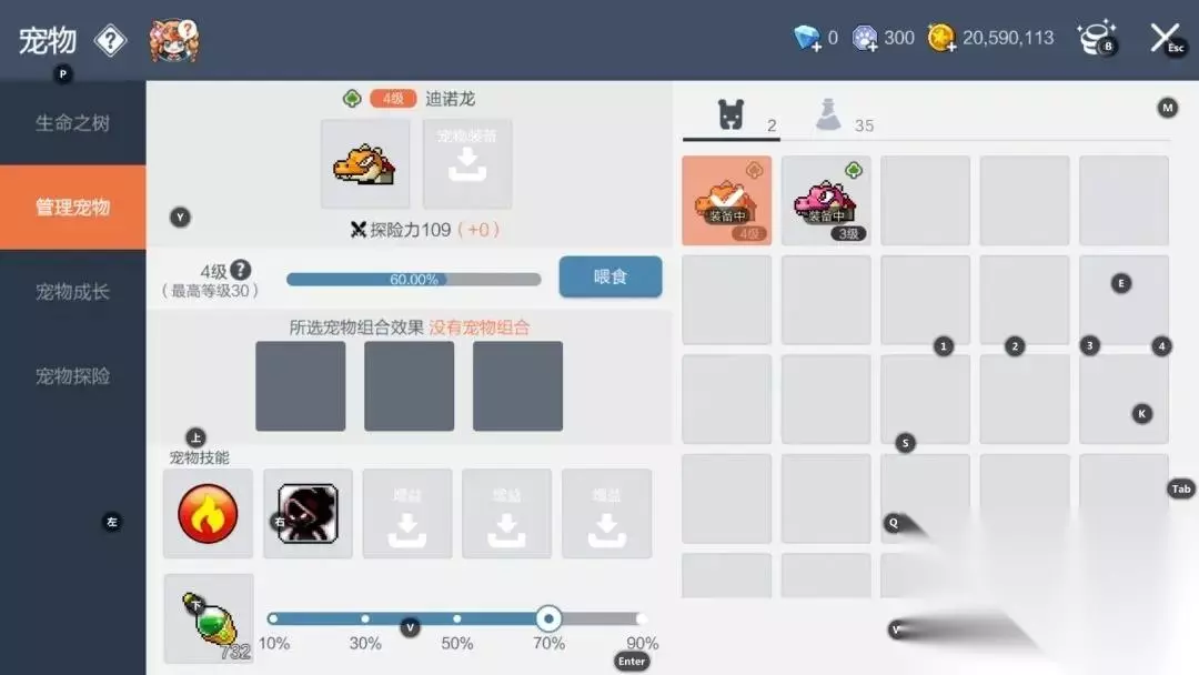 2、然后菜单-宠物栏-管理宠物随意点击一个宠物,然后把自动吃药也设置到70,如果设置到70还是会死的话,那就设置到90,这样的话在自动挂机的时候一定要备好药水喔~然后在这个界面咱们还能把辅助技能增加上去(辅助技能放在技能栏里自动战斗不会自动使用),不然的话辅助技能还要手动开非常麻烦,很多玩法师的职业一定要记得增加不然花还是手动去开~