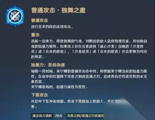 芙宁娜的普通攻击和其他枫丹角色一样,每6秒会带有荒芒性态或芒芒性态的元素伤害。她可以通过发动强击来切换自身的荒或芒性态,一旦切换成功,她的E技能所召唤的召唤物也会对应地切换为荒或芒的形态。 E技能——孤心沙龙