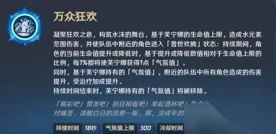 芙宁娜的大招是她的核心技能之一,可以提供辅助效果。当芙宁娜释放大招时,会先造成一定程度的水属性伤害,接着根据全队角色的生命值上升或下降的幅度来计算气氛值。每变化1%,芙宁娜就会获得1点气氛值。当芙宁娜获得100点气氛值时,可以提升全队角色25%的伤害和10%的受治疗加成。对于0命芙宁娜而言,气氛值上限为300点。因此,要最大化0命芙宁娜的加伤效果,需要将她绑定在群奶上。 当气氛值达到100时,屏幕下方会出现3名观众;达到200时,观众人数将增加到7人;若气氛值达到300,则会吸引更多的观众。当屏幕出现水纹震动时,说明气氛值已经达到最高峰。