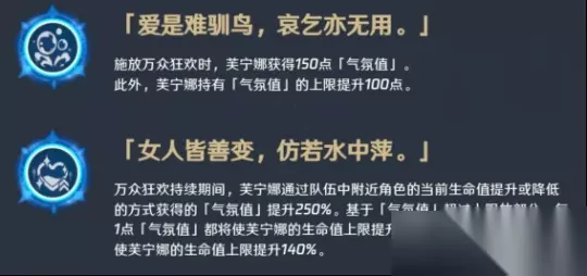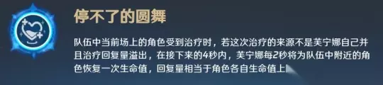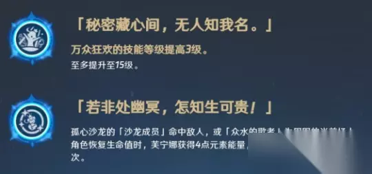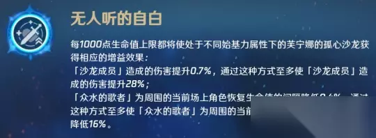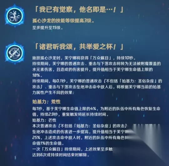 芙宁娜的固有天赋1让芙宁娜可以将队友溢出的全体奶转化为全队奶,减少了芙宁娜对群奶的依赖。 固有天赋2——无人听的自白