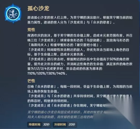 E技能为芙宁娜输出的核心技能。开启E技能时,根据当前的荒芒属性召唤对应的召唤物: 荒属性 你可以召唤出海马、章鱼和螃蟹这三个水形幻灵,它们会根据当前场上角色攻击的目标攻击附近的敌人。海马、章鱼和螃蟹三者之间的伤害比大约是1:1.8:2.6,它们的攻击间隔是相同的。 海马:1.6s/hit左右 章鱼:3.3s/hit左右 螃蟹:5.2s/hit左右 在战斗中使用技能进行输出时,如果全队有生命值高于50%的角色,可以选择烧掉该角色的一些生命值,来提升技能的输出能力。这就是许多人口中的“0命芙宁娜的毒点”,也就是通过绑定群体治疗来实现最大化输出。如果想要让其他角色如胡桃绑定盾或者香菱绑定班尼特也能成为“毒点”,就需要找到其他能抬升输出的方式。 芒属性 召唤一个歌者,歌者可以为队伍提供不受距离限制的前台加血,效果类似于心海E技能,但不具备加抗和伤害的能力。 芙宁娜的E技能能够持续的时间要比冷却时间长,因此可以毫不间断地使用。当芙宁娜使用大世界传送时,E技能所召唤的生物也会跟随她移动。在E技能的持续时间内,芙宁娜能够自如地行走在水上,因此她是新任最容易渡海的真君。 Q技能——万众狂欢