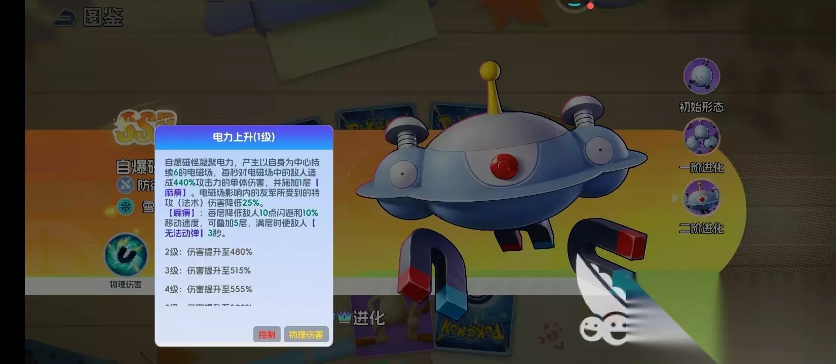 当三合一磁怪完成最终蜕变,那最终就会变成自爆磁怪,此时的他已经将三种不一样的核心融合为一体,就可以直接化作锋锐的利刃,中央的红色核心就好像是跳动的心脏一样。核心技能就是电力上升,这就是进化之力的一个表现,主要是以自身作为中心,然后就可以展开持续6秒的电磁场。每一秒针对范围内的敌人就可以造成440%的攻击力单体伤害,并且还会形成一个麻痹的效果。这不仅是纯粹的伤害输出,更是成为全方位的战场辅助能力,可以有效降低25%的守护,而且麻痹还会层层的削弱敌人的闪避。在满层时就可以让敌人陷入到三秒无法动弹的状态,可以直接改变胜负的走向。