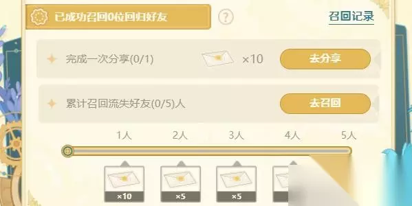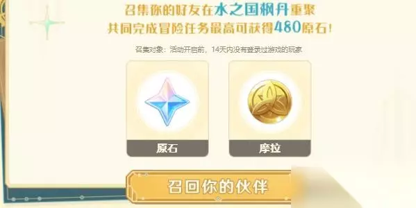 活动攻略 1、召集好友重新回到原神,活动期间完成对应的冒险任务,即可获得原石、摩拉奖励。