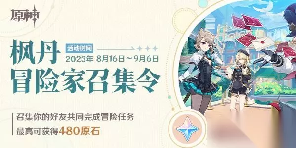 原神枫丹冒险家召集令活动入口: 活动:枫丹冒险家召集令 时间:2023.8.16-2023.9.6 入口:点击进入 要求: 冒险等阶≥10级的旅行者即可参与活动。 本次活动同账号下仅限首次绑定的UID参与活动。 奖励: