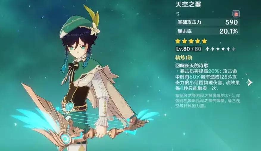 输出向玩法武器推荐,五星武器可以使用天空之翼,这把武器高额白值,尊贵双暴,可以大大提高温迪的输出能力,若水,冬极白星都可以,四星武器推荐绝弦,这也是温迪最佳的四星武器,适合反应队,可以利用温迪大招“染火扩雷”“染水扩雷”打出不俗的伤害,另外还有风花之颂、落霞、苍翠猎弓都是可以的。