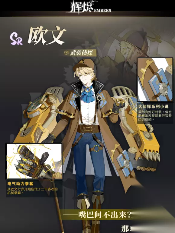 辉烬欧文是万事通侦探社的社长,他有着卓越的探案能力,并且奉行着嘴巴问不出来的东西用拳头来问的探案方式,这样的他受到了各个阶层的委托,也被称为武装侦探,让玩家对其充满了好奇,那么辉烬武装侦探怎么样,下面就来带领大家看一看他在战场上的实际表现。