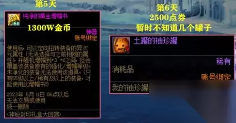 第五天奖励:纯净的黄金增幅书 1300w金币解锁 第六天奖励:土罐的袖珍罐 2500点卷解锁