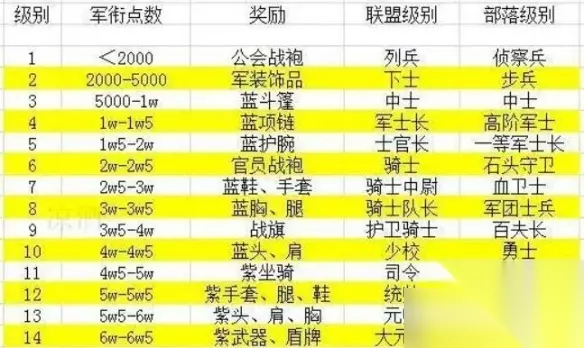7、骑士中尉/血卫士 军衔点数:25000-30000 8、骑士队长/军团士兵 军衔点数:30000-35000 9、护卫骑士/百夫长 军衔点数:35000-40000 10、少校/勇士 军衔点数:40000-45000 11、司令/中将 军衔点数:45000-50000 12、统帅/将军 军衔点数:50000-55000
