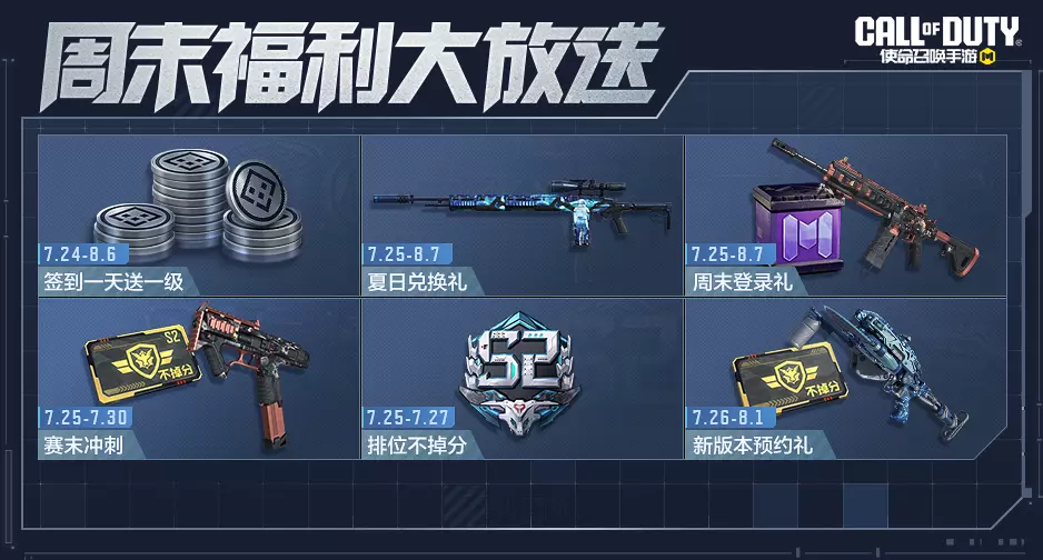 7月21日,周末福利大放送再次来袭。本周夏日兑换礼、赛末冲刺陆续登场,轻松获得史诗级武器。把一周福利分享给自己的战友,即可获得开开开箱和福利点券。