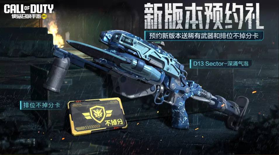 7与26日(本周六),新版本预约礼活动上线,战士们预约新版本,即可获得稀有级武器D13 Sector-深涌气泡和排位不掉分卡。