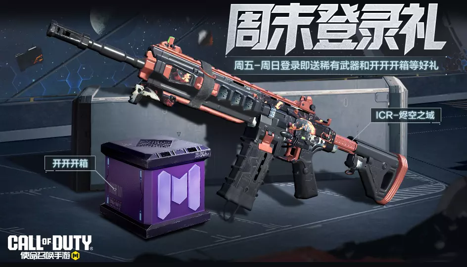 ● 【周末登录礼】欢乐来袭,登录游戏,就能拿走稀有级武器ICR-烬空之域;