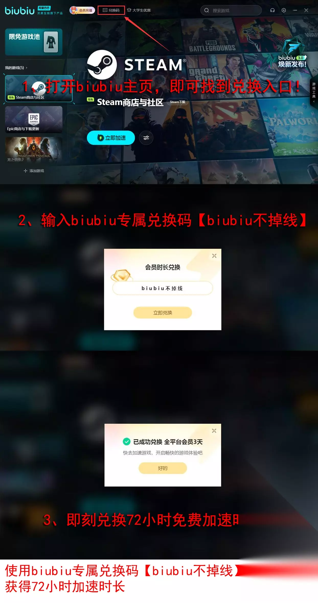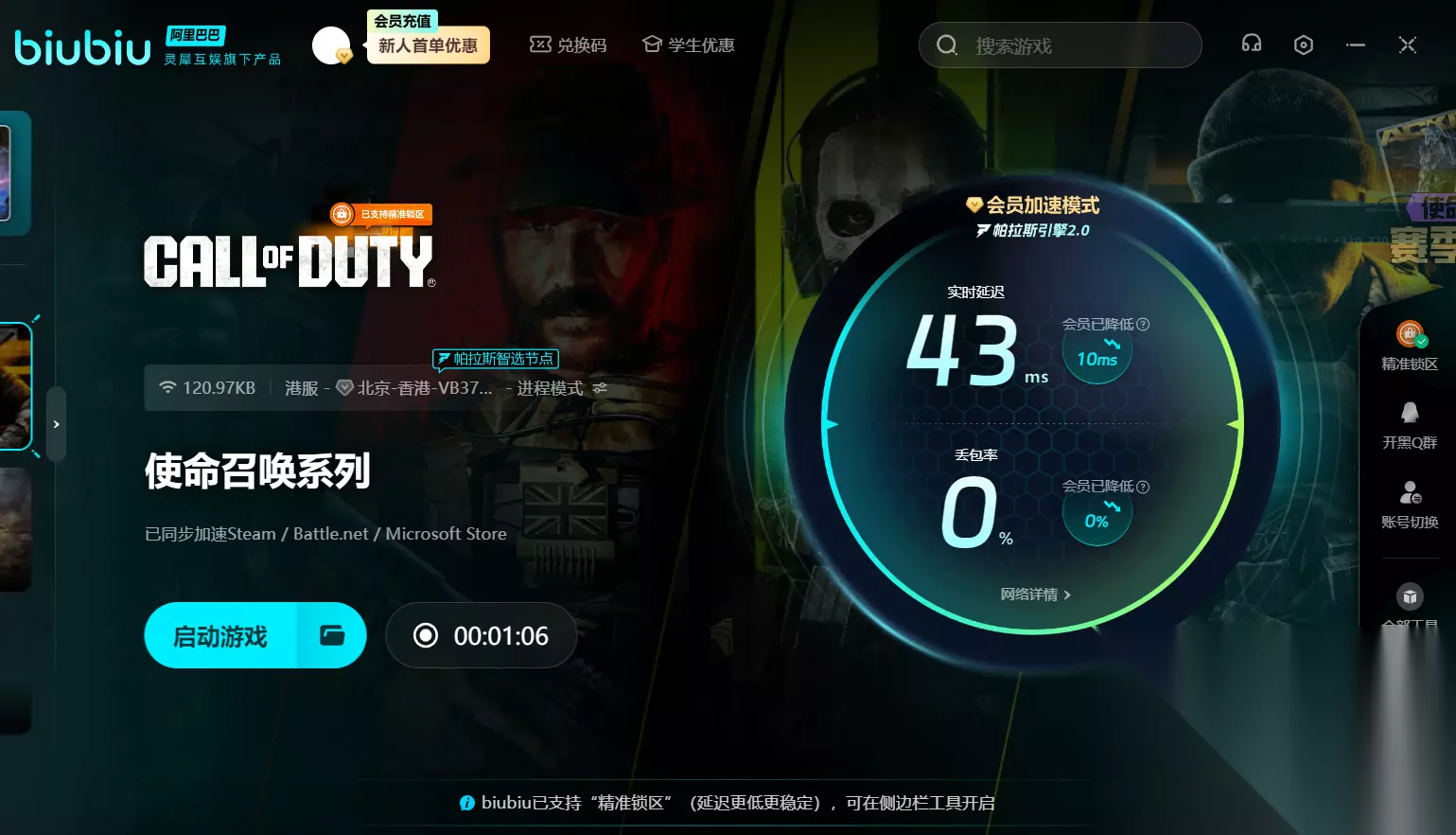 现在注册biubiu加速器还可享受限时福利,新用户登录即可获得24小时全平台免费会员加速服务,输入专属口令【biubiu不掉线】,额外领取72小时免费时长,累计可享96小时高速畅玩体验,轻松应对黑屏、卡顿与延迟问题,畅快投入战场对决。