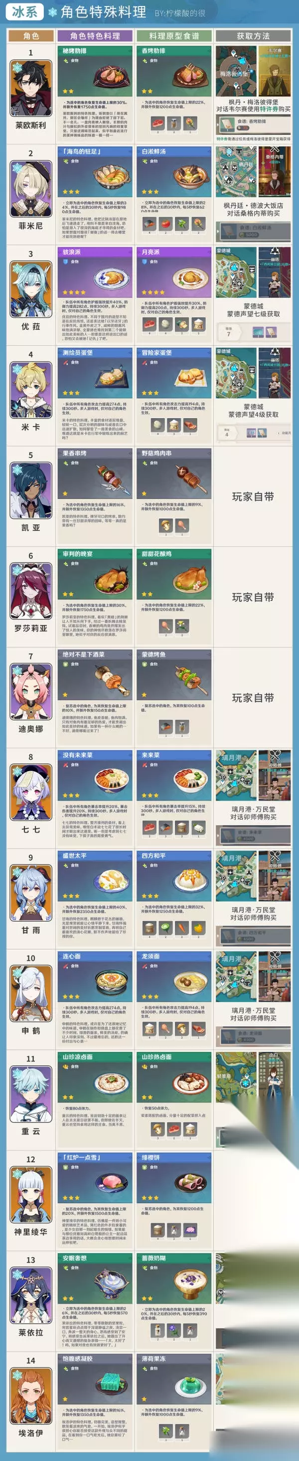 冰 莱欧斯利 - 秘烤肋排 菲米尼 - 海鸟的驻足 优菈 - 骇浪派 米卡 - 测绘员蛋堡 凯亚 - 果香串烧 罗莎莉亚 - 审判的晚宴 迪奥娜 - 绝对不是下酒菜 七七 - 没有未来菜 甘雨 - 盛世太平 申鹤 - 连心面 重云 - 山珍凉卤面 神里绫华 - 红炉一点雪 莱依拉 - 安眠奢望 埃洛伊 - 饱腹感凝胶