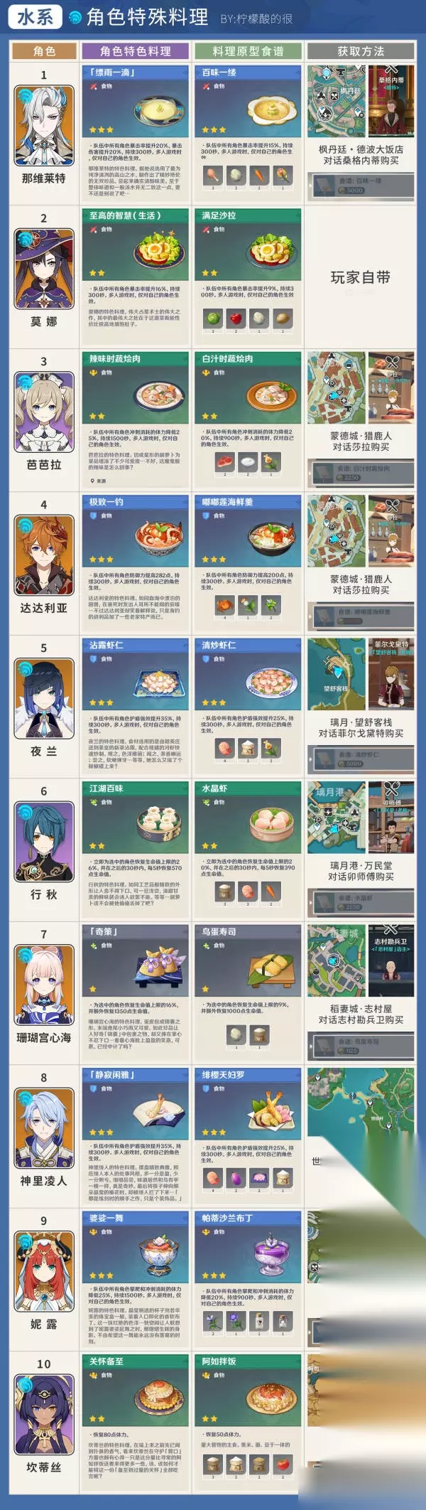 水 那维莱特 - 「缥雨一滴」 莫娜 - 至高的智慧 芭芭拉 - 辣味时蔬烩肉 达达利亚 - 极致一钓 夜兰 - 沾露虾仁 行秋 - 江湖百味 珊瑚宫心海 - 奇策 神里绫人 - 静寂闲雅 妮露 - 婆娑一舞 坎蒂丝 - 关怀备至