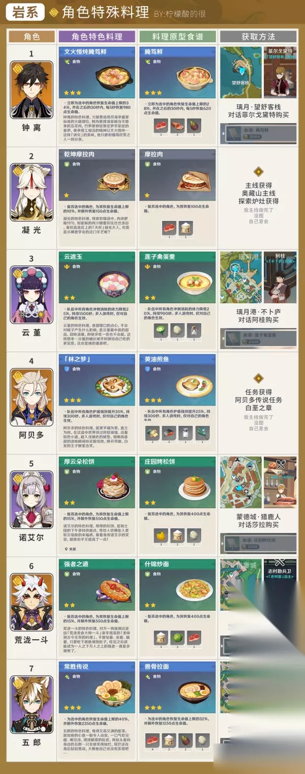 岩 钟离 - 文火慢炖腌笃鲜 凝光 - 乾坤摩拉肉 云堇 - 云遮玉 阿贝多 - 林之梦 诺艾尔 - 厚云朵松饼 荒泷一斗 - 强者之道 五郎 - 常胜传说