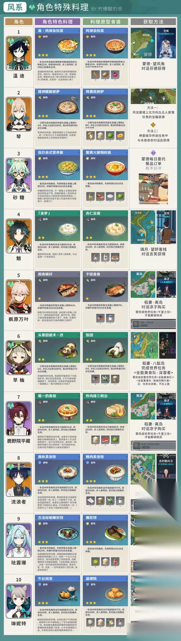 风 温迪 - 真·风神杂烩菜 琴 - 提神醒脑披萨 砂糖 - 伍玖叁式营养餐 魈 - 美梦 枫原万叶 - 雨奇晴好 鹿野院平藏 - 唯一的真相 早柚 - 头晕回避术·改 散兵(流浪者) - 真味茶泡饭 珐露珊 - 古法秘制椰炭饼 琳妮特 - 午后闲茶