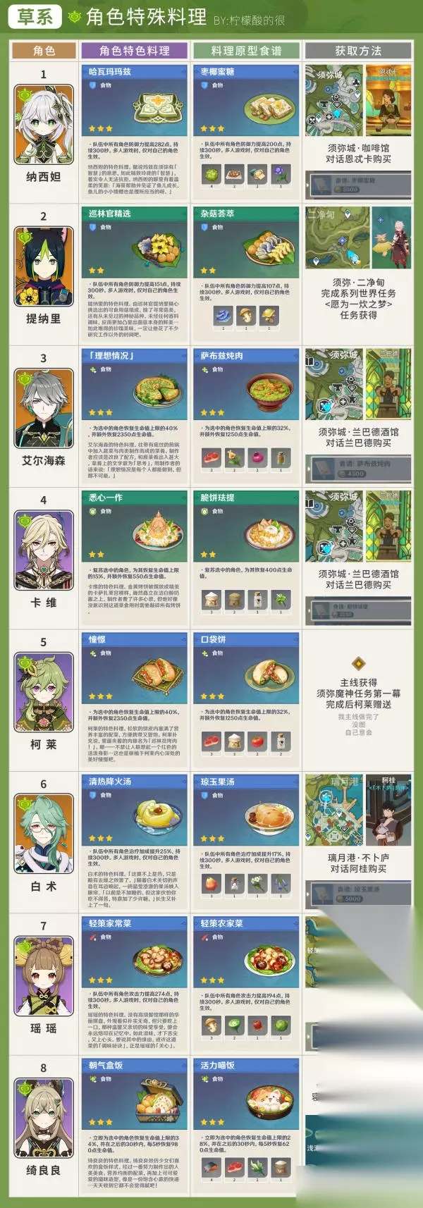 草 纳西妲 - 哈瓦玛玛兹 提纳里 - 巡林官精选 柯莱 - 憧憬 艾尔海森 - 理想情况 卡维 - 悉心一作 白术 - 清热降火汤 瑶瑶 - 轻策家常菜 绮良良 - 朝气盒饭