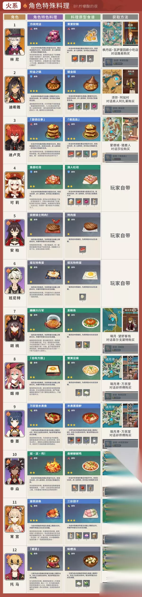 火 林尼 - 方块戏法 迪希雅 - 炽金之锅 迪卢克 - 蒙德往事 可莉 - 鱼香吐司 安柏 - 侦查骑士烤肉! 班尼特 - 提瓦特焦蛋 胡桃 - 幽幽大行军 烟绯 - 自有方圆 香菱 - 万民堂水煮鱼 辛焱 - 摇滚鸡! 宵宫 - 夏祭游鱼 托马 - 暖意