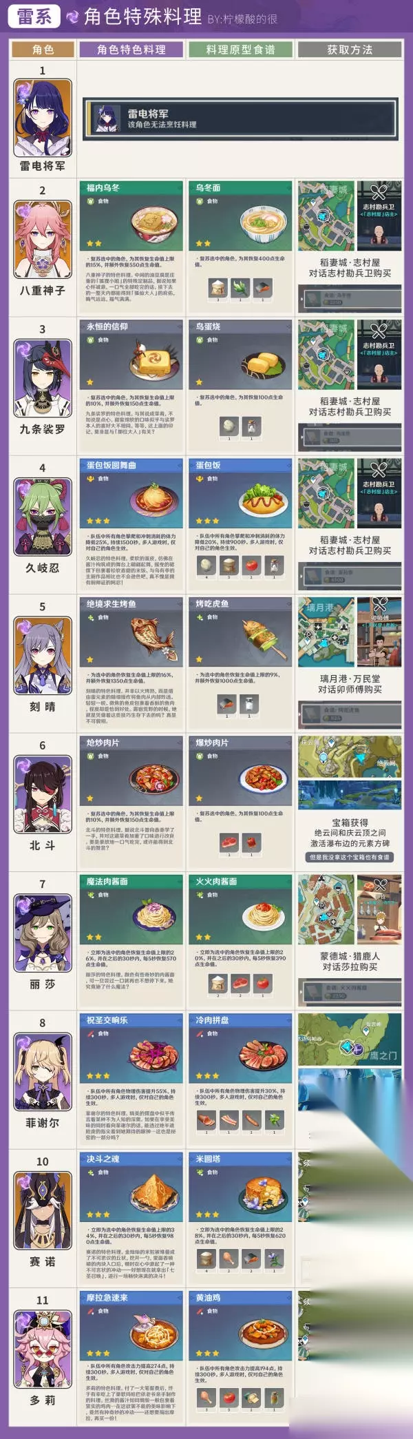 雷 雷电将军(无法烹饪料理) 八重神子 - 福内乌冬 九条裟罗- 永恒的信仰 久岐忍 - 蛋包饭圆舞曲 刻晴 - 绝境求生烤鱼 北斗 - 炝炒肉片 丽莎 - 魔法肉酱面 菲谢尔 - 祝圣交响乐 雷泽 - 爪爪土豆饼 赛诺 - 决斗之魂 多莉 - 摩拉急速来