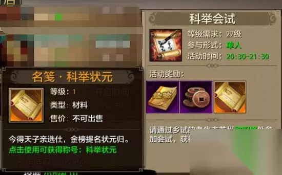 天龙八部手游科举应该怎么玩?天龙八部手游科举玩法解析。科举是天龙八部手游中比较经典的一项玩法,今天小编就来给大家介绍一下关于天龙八部手游科举玩法的解析。 【科举】 科举是天龙八部手游中比较经典的限时玩法,这个活动的参与时间还是非常富裕的。从每天的08:00到20:30都可以参加科举的乡试。 一共需要回答40道问题。答对获得经验和铜币的奖励。答错奖励减半。完成全部40道题,还可以额外获得一个金榜题名礼包。此外,每天晚上20:30-21:30,还可以参加科举的会试。不但奖励经验和铜币,还可以得到状元,榜眼,探花的称号奖励。 这个可是游戏内唯一的称号。想要参加科举会试,首先要在科举乡试中取得非常好的成绩,然后会试还会随机抽取一些参加过乡试的玩家参加。主要是看运气哦。科举想要获得好的成绩,文化知识和游戏知识都非常的重要。