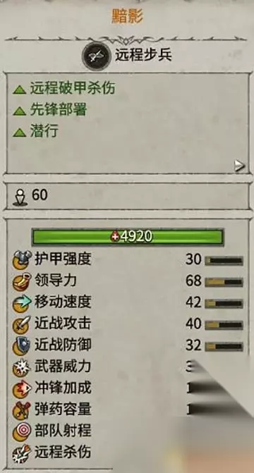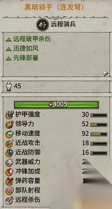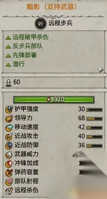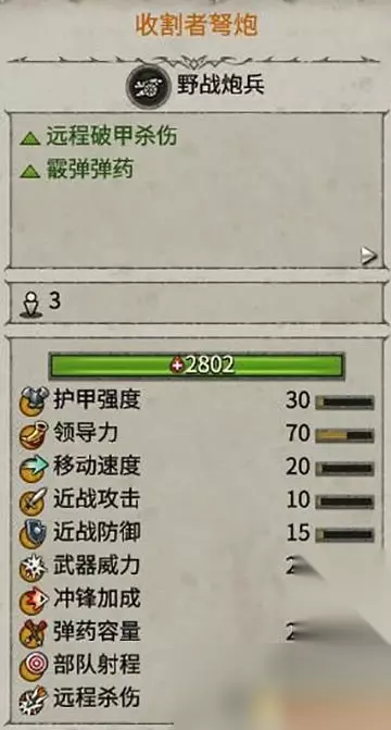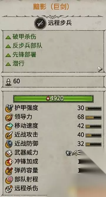 部署范围很大,拥有潜行能力和远程破甲能力。 是突袭敌人后排,切割阵线的有效部队。
