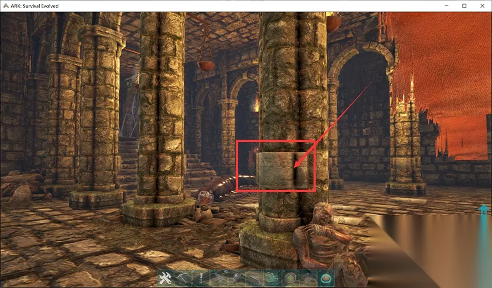 大门两边各有一个按钮,朝门靠右第三根柱子,那个有两个按钮,尸体头上那个按下去就行了。 拿完狡诈咱再回头来到这个大厅,原路走到图2的位置,那个位置最好爬着走,如果你不想被麻醉箭射的话。