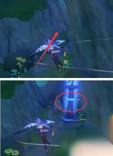 6、继续向前飞即可看到一个缝隙,这个位置有一个七天神像。