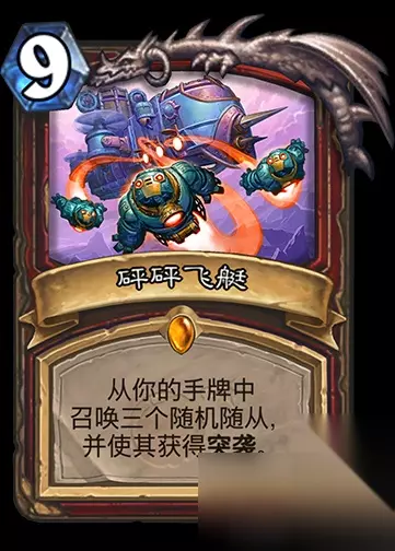 这套牌的获胜关键卡,在牌库抽光,自己场上无超大屁股随从的时候,手上留六张牌:蓝龙,双怒火,旋风斩,克苏恩和上面的这个砰砰飞艇。打法是先下砰砰飞艇,直接拉下去这两个怪,然后用双怒火打克苏恩和蓝龙,最后接旋风斩,场上全清,直接获胜!