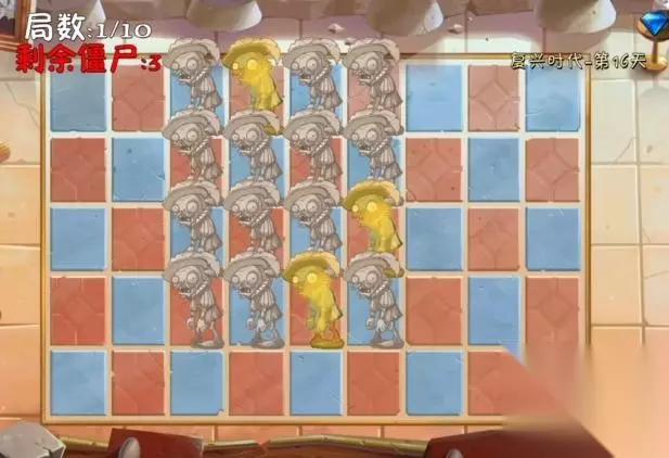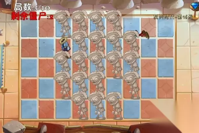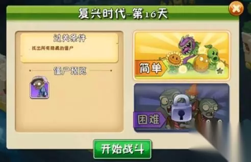 植物大战僵尸2复兴时代第16天有两个模式,一个是简单模式,一个是困难模式,每个模式总共是10小关, 简单模式: 1、开始战斗,