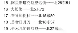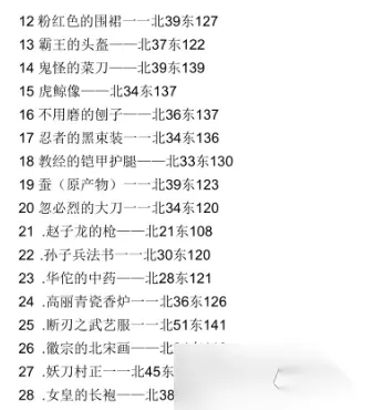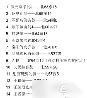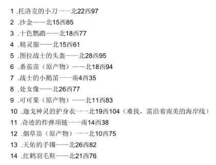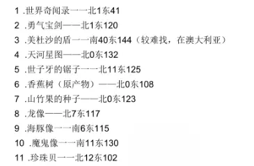 非洲 1.圣母像——南23 东14 2.犰徐的铁皮——南15 东46 3.深红连环神甲——南4 东39 4.银盔——北21 西17 5.莱姆的滴汁——北0 东6 6.插图的圣经——南18 东36 7.卡涅姆勇者的盾——北3 东9 8.狂徒骑士铠甲——北5 西3 9.忠诚的偃月刀——南25 东46 10.孔雀袍——南47 东37(较难找,需打开大地图) 11.印度的琉璃剑——南10 东40 12.医学典范——北8 东50 新大陆