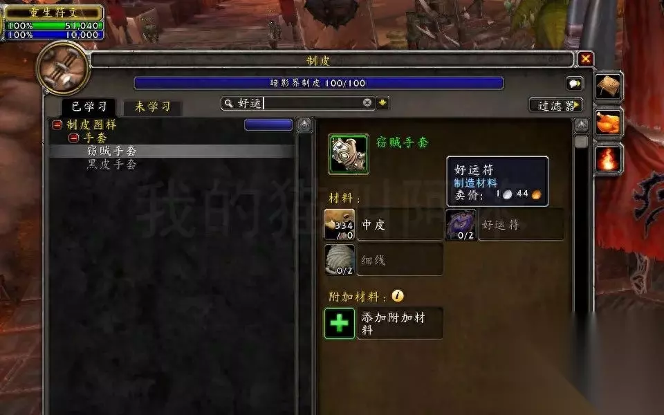 好运符 制皮有两个手套需要。用贼号在石爪山脉右下角的恐怖图腾营地一圈就能偷齐。