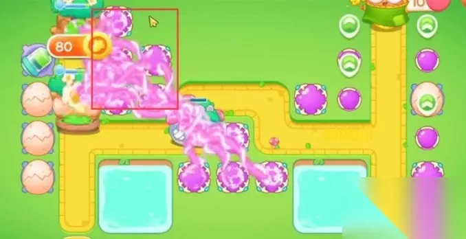 4.在如图所示方框所示处放置满魔法球,魔法球的持续高额攻击 可以对路径中的兔子及障碍都造成大量伤害,