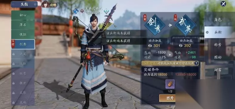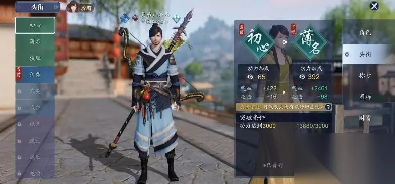 天涯明月刀手游头衔系统介绍: 一、头衔简介: 天涯明月刀手游里,玩家在到达一定的功力阶段后就可以进行头衔的提升,头衔越高代表着玩家越强。 二、位置介绍: 头衔系统就是展示在少侠人物名字左侧的的图标,图标会清晰的显示出玩家目前所处的头衔。